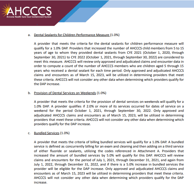 As far as dentistry is concerned, there are three specific performance measures and criteria that qualify providers for a 1.0% DAP fee increase for each performance measure met.