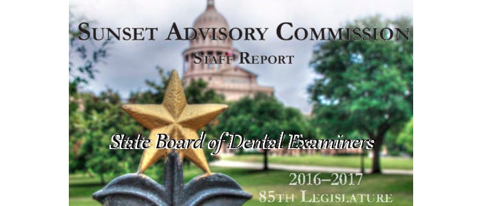Yesterday, the Sunset Advisory Commission introduced both a House and Senate bill to adopt their proposed changes to legislation affecting the State Board of Dental Examiners. HB 2990 was introduced as authored by Sunset member state Rep. Cindy Burkett while SB 313 was introduced as authored by Senators Schwertner, Hinojosa, Nichols, Van Taylor and Watson.